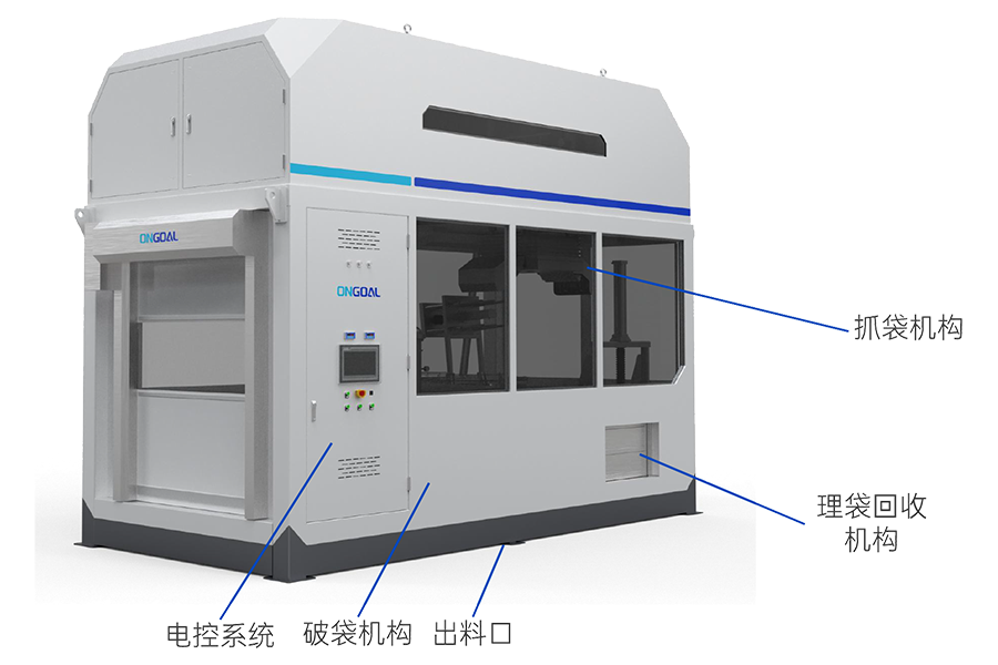 具備單獨除塵、粉塵回收及廢袋回收功能,廢袋通過多級擠袋機構,保證擠袋效果,解決廢袋回收及逸塵問題。