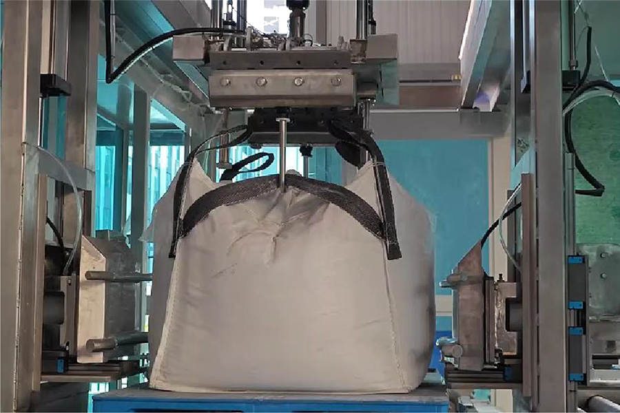 全自動噸袋抓取機構,采用雙浮動掛鉤設計,抓取噸袋側面的橫向圍帶,利用浮動掛鉤適應噸袋側面變化,并具有自檢測與自糾偏功能,實現對噸袋的穩固抓取。
