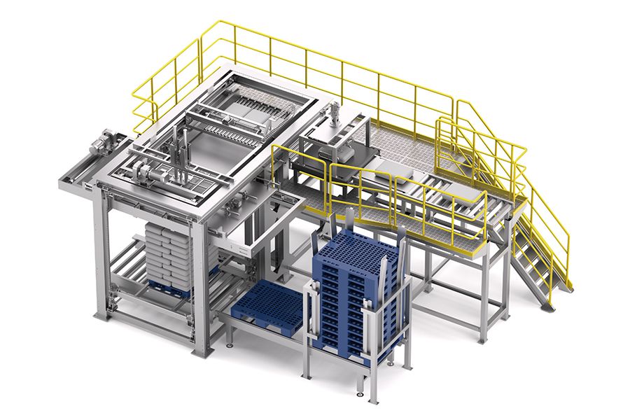 整機采用有限元分析和模塊化設計:適用多種袋型,可設置多種碼垛樣板。標配由整平、轉向、編組排層、推包、分層、升降、托盤輸送、輥筒線以及控制系統組成。