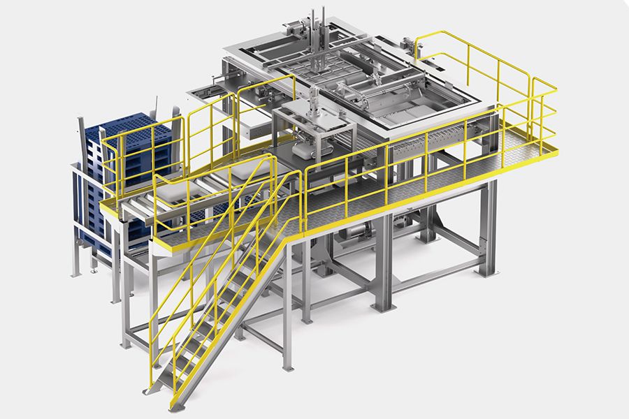 配套自動托盤輸送系統:適用多種結構和尺寸的托盤。標配SEW減速電機,確保輸送效率和穩定性;另可選配對托盤以及垛頂上紙板或者覆膜。